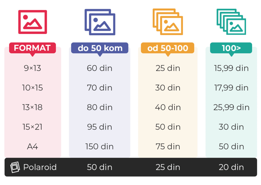Napomena: Samo ukoliko imate minimum 100 fotografija jednog formata mozete ostvariti najveci popust, ako imate 50 fotografija jednog formata i 50 fotografija drugog formata, popust ce biti 50% a ne 70%.